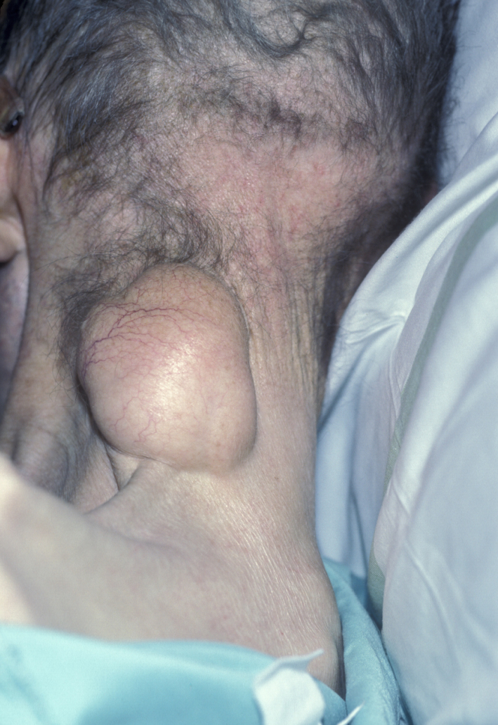 Benign tumours of the neck - benign tumours of salivary gland origin are most common. Schwannoma (usually benign tumour of the tissue covering nerves), neurofibroma (another type of benign nerve sheath tumour) and malignant tumours such as neurosarcoma account for approximately 25% of primary neck tumours, and the paragangliomas (tumours that originate in nerve tissue or near certain nerves and structures of blood vessels; see below) account for approximately 15%. Miscellaneous lumps such as lipoma (see Figure 10) and rhabdomyoma (benign tumour of skeletal muscles) are comparatively rare in the neck.
