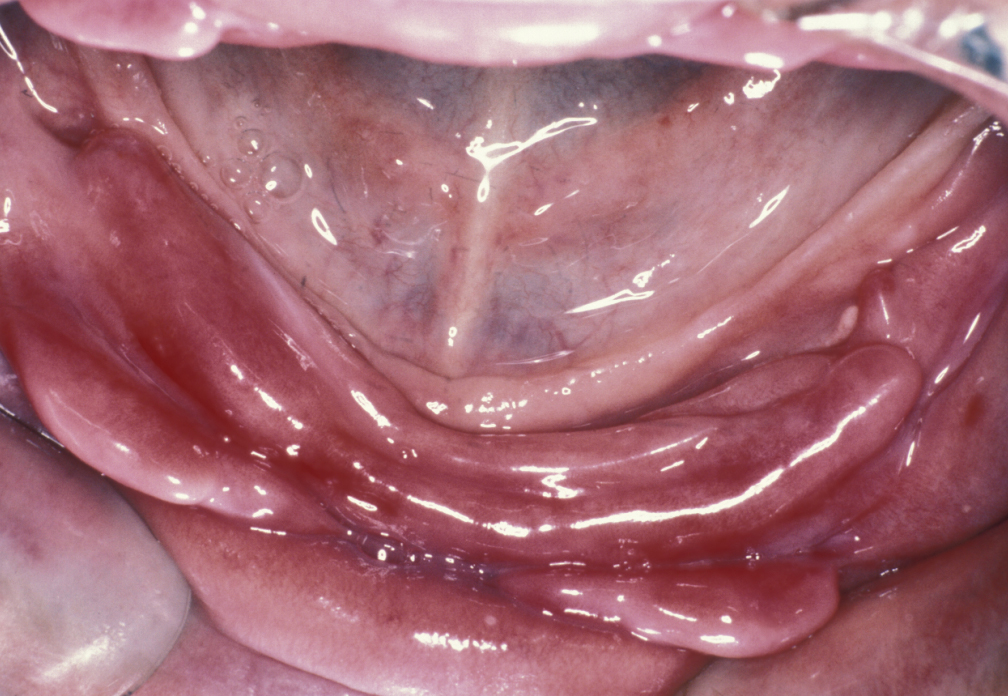Particularly notable is irritation hyperplasia, which is a hyperplastic response to repeated trauma following denture-induced ulceration. Rolls of hyperplastic tissue which may be quite erythematous (red) and resemble malignant disease are seen particularly in the buccal sulci (see Figure 6). This condition is more common in the lower jaw than the upper. Histology is similar to the fibroepithelial polyp (see above).