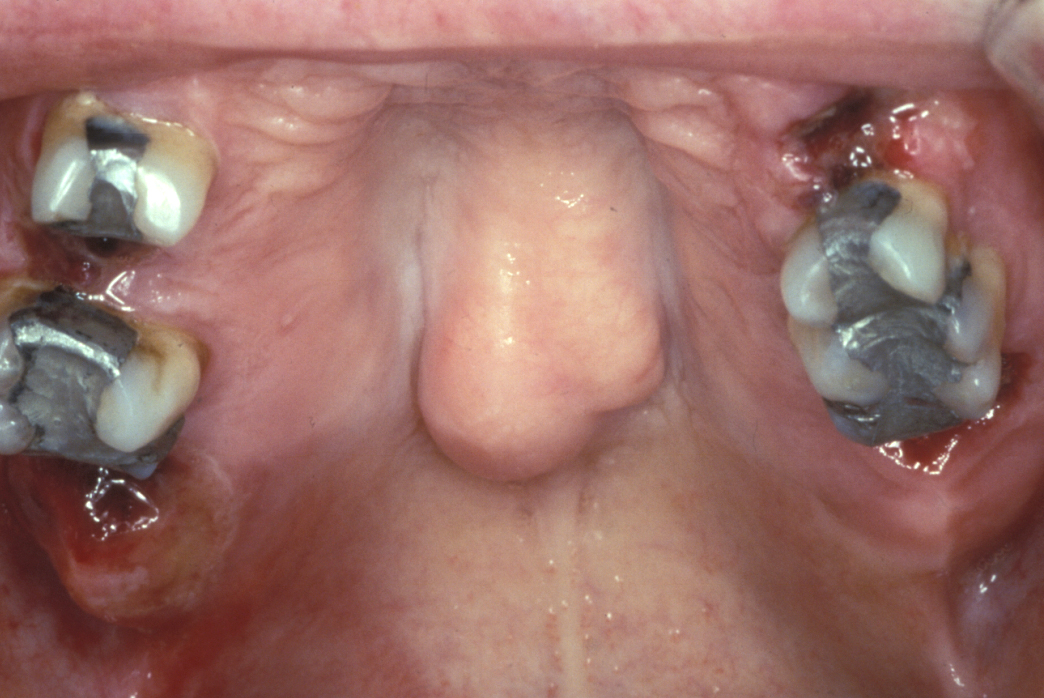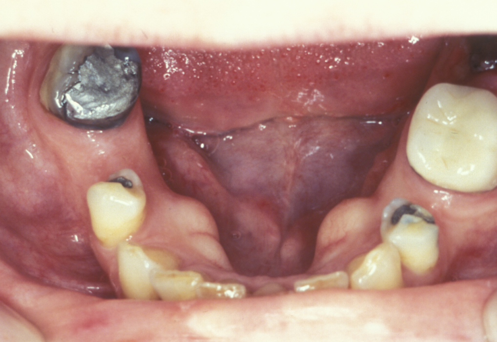 A torus is a bony exostosis (outgrowth) of the jaw. Torus palatinus occurs in the centre of the hard palate (see Figure 9), torus mandibularis occurs in the lingual (tongue-side) premolar or molar region of the mandible (see Figure 10). These lesions are entirely benign and only require removal when they are symptomatic or for reasons of prosthetic functionality.