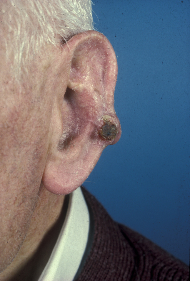 These usually arise in sun-damaged skin, especially of the scalp and ear, presenting as a raised nodule, an ulcer with raised everted edges or as a fleshy fungating lesion (see Figure 4).