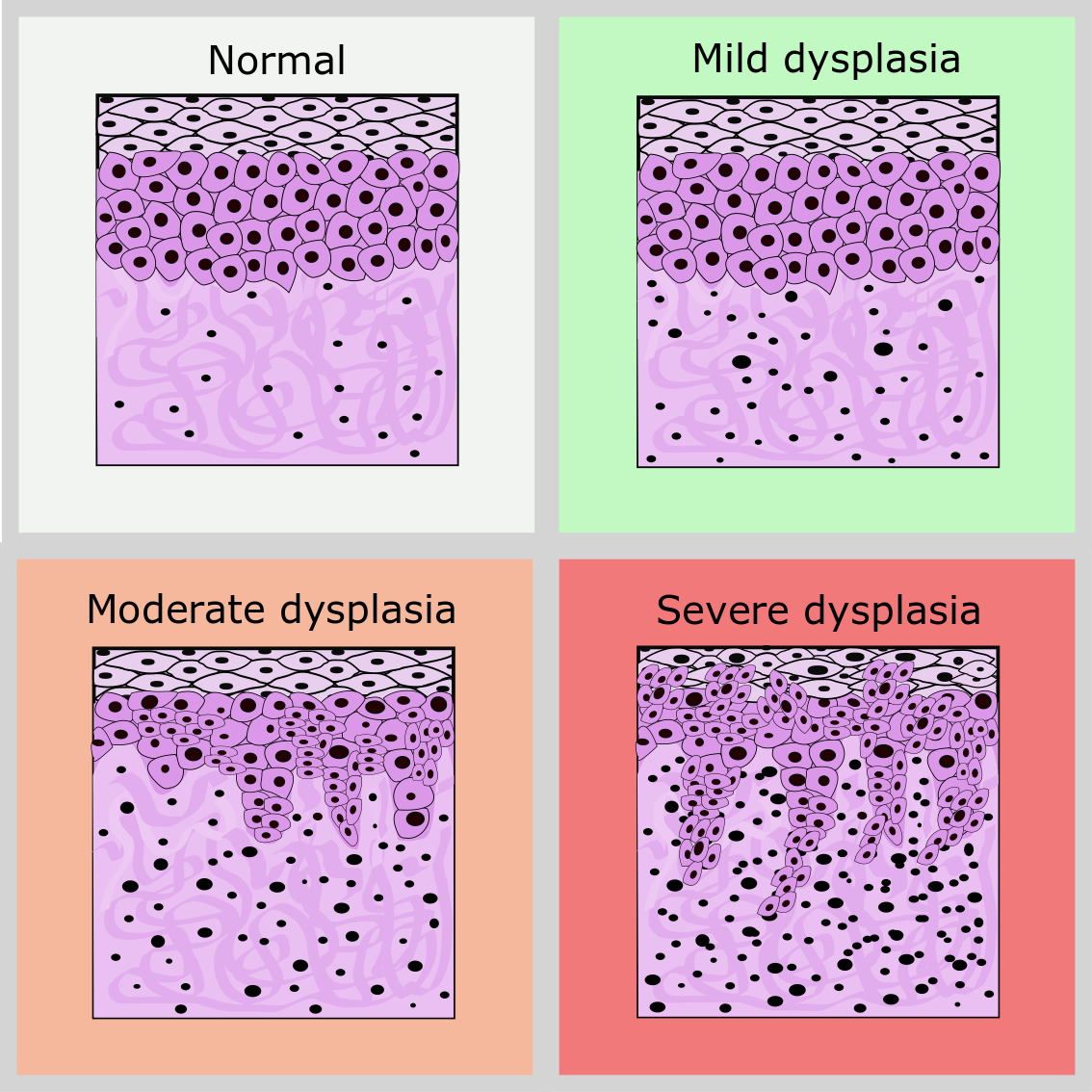 Taking biopsies of suspect oral lesions is a widely used diagnostic method. However, the method is invasive and requires macroscopic samples to be excised (sometimes repeatedly over time), so there are limits to how often this approach can be taken. In addition, a biopsy sample is just a snapshot of the current state of a tissue and, in the absence of further information, does not provide unambiguous clues as to the likely behaviour of the lesion in the future, nor does it explain why the lesion developed in the first place. On the positive side, a biopsy sample is well suited to classify the degree of abnormal cell growth in tissue (Figure 1) from mild to severe dysplasia.
