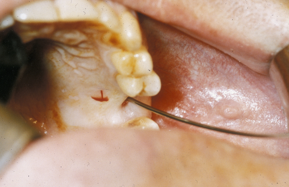 The most common cause for a fistula in the maxillofacial region is a dental abscess, with opening to the mucosa on the inside of the mouth depending on the position of the tooth root. It can rarely open onto the skin (usually from lower front teeth, or a front tooth, onto the chin and may be subjected to multiple ineffective operations by surgeons not aware of the cause). Other common types of fistula are connections between oral and nasal cavity, or connections between the maxillary sinus (hollow space above the upper jaw) and the oral cavity (see Figure 2; this latter type of fistula is a possible complication of tooth extractions in the upper jaw). A cleft palate may be considered a particular type of fistula.