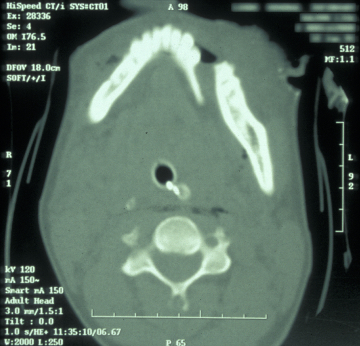 If the patient is unable to stand in the DPT machine, left and right lateral oblique mandibular views will give good imaging of the body of the mandible. If the patient has multiple complex maxillofacial fractures a CT scan (CT coronal and axial images, with or without 3D reformatting) is helpful (see Figure 4). The CT scan will help assess condylar fracture position, angulation and any fractured dislocation of the condylar head. A CT scan is also useful to image multi-part mandibular body fractures.