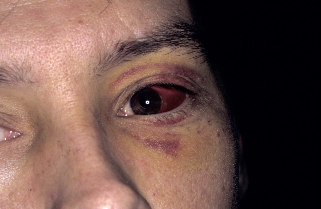 There is facial asymmetry, loss of cheek prominence and indentation of the zygomatic arch (dimpling over fracture) although these can be masked by swelling. Subconjunctival haemorrhage (see Figure 6) suggests direct trauma to the eye or fracture of the orbital walls or floor. A complete lateral subconjunctival haemorrhage usually indicates a zygomatic fracture. Medial subconjunctival haemorrhage implies naso-orbital fracture. Eye position needs to be examined from in front, below and above because otherwise subtle changes may not be seen if swelling is marked.