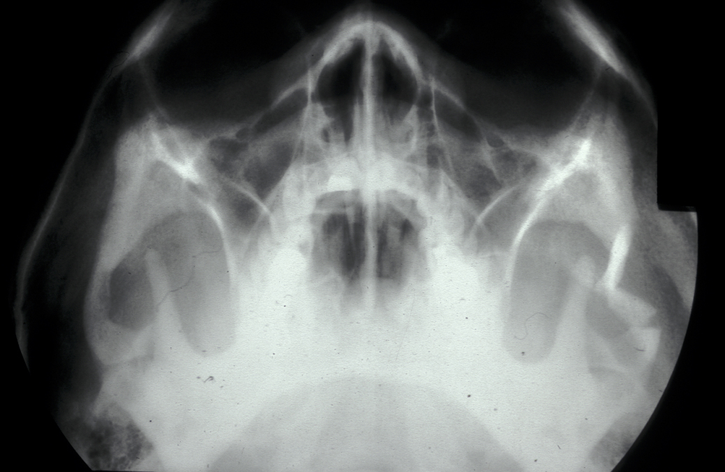Plain film X-ray radiographs from different angles generally give sufficient diagnostic information. Combined they give good imaging of the zygomatic complex and can be used to determine the level of displacement and fracture pattern. Teardrop appearance into the maxillary antrum suggests an isolated orbital floor fracture (a 'blow out orbital fracture'; see Figure 8). Identification of this type of fracture mandates further investigation by a coronal (vertical plane view) CT scan and Hess chart test (eye test to assess motility of the eye).