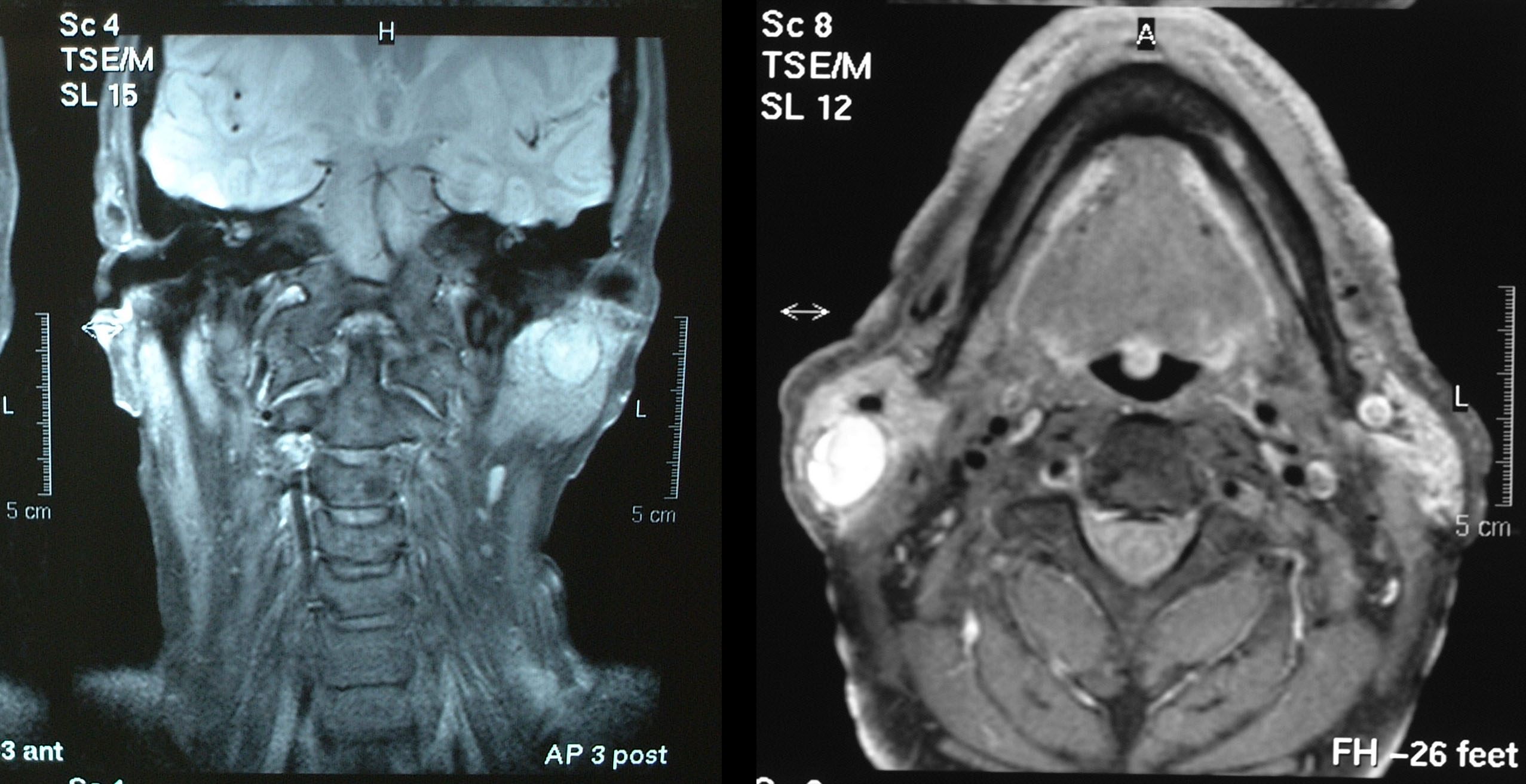 The parotid gland consists almost entirely of serous acini (cells that produce serous (watery) fluid; see below about physiology). The gland lies in the retromandibular fossa (near the angle of the mandible and in front of the ear) and has three surfaces. Its lateral surface is located subcutaneously and is enveloped in a tight fascia (connective tissue). This fascia is related to the subcutaneous musculoaponeurotic system (SMAS layer: a fairly inelastic layer of fibres and muscles in the deep skin layers of face and neck), with the greater auricular nerve branching anteriorally (in the front) into the skin and to the posterior (to the back) to the lobe of the ear. Its anterior surface wraps around the posterior border of the ramus of the mandible (the part of the mandible rising from the mandibular body, posterior to the molar teeth) and abuts the masseter and medial pterygoid muscles (cheek muscles). The deep surface of the parotid gland is complex and is related to the mastoid process (a space at the base of the skull, behind the ear), the posterior belly of the digastric muscle (small muscle under the jaw), the styloid process (small bone beneath the ear) and its associated muscles and ligaments, and the external carotid artery. Figure 1 shows MRI views of the parotid glands from two different angles.
