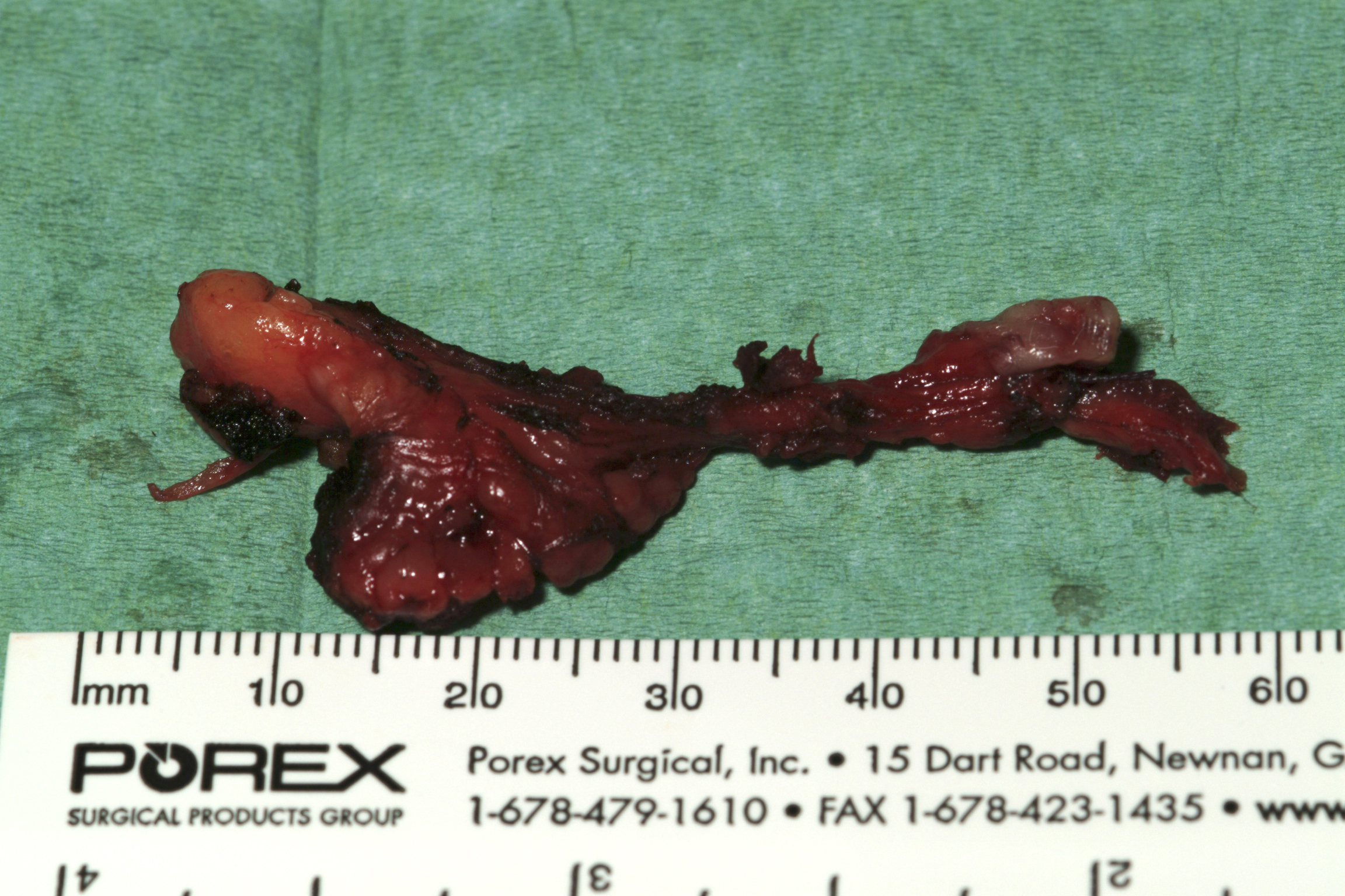 The submandibular gland is a mixed serous and mucinous gland (it produces a mixture of serous and mucus-rich secretion; see below). It is comprised of a large superficial lobe and a smaller deep lobe which is in continuity with the superficial lobe as it wraps around the posterior border of the mylohyoid muscle (running from the mandible down to the hyoid bone (a flat U-shaped bone in the middle-front of the neck). The gland is covered by a fibrous capsule. Figure 3 shows an excised submandibular gland.