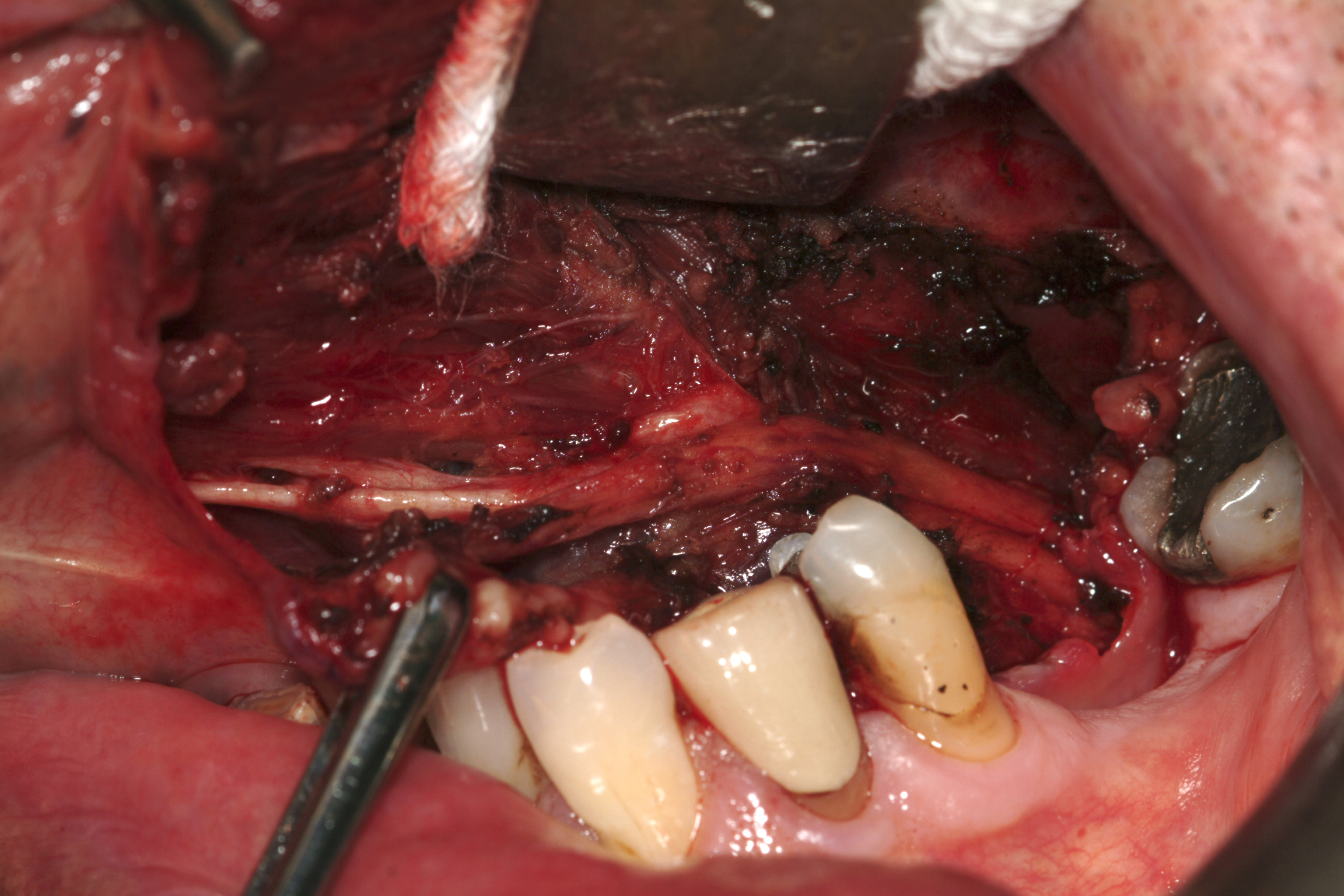 The sublingual glands are mucinous glands (producing mucus-rich secretion) which lie on the mylohyoid muscle and are covered superficially by the mucosa (lining) of the floor of the mouth. Rather than one duct, they have several small ducts which open directly into the mouth and also into the submandibular duct. Their intimate relation to the lingual nerve and submandibular duct mean these are potentially at risk of injury during surgery (see Figure 4).