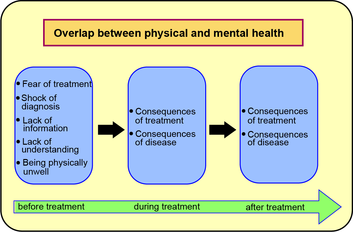 The relationship between physical and mental health adversely affects individuals’ quality of life as well as society as a whole. The World Health Organization (WHO) states that ‘health is a state of complete physical, mental and social well-being and not merely the absence of disease or infirmity’ and further emphasizes that ‘there is no health without mental health’. The well recognised inextricable links between physical and mental health explain the increased risk of developing poor mental health on top of suffering from a physical disorder, or mental disorders leading to poor physical health. The scheme in Figure 1 illustrates as an example how at every stage of a physical illness, mental health may be affected.