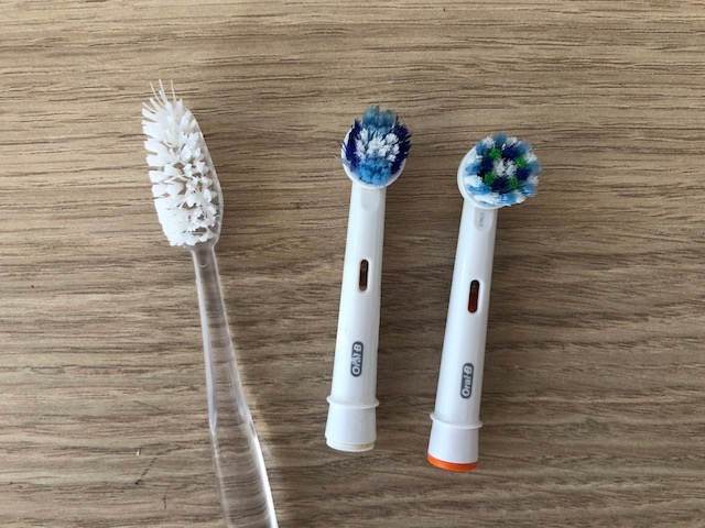 All tooth brushing should employ a systematic approach. This allows all tooth surfaces to be attended to. The buccal surfaces (facing out), the palatal & lingual surfaces (facing into the palate and tongue) and occlusal surfaces (the biting surfaces) must all be brushed. Brushing should take at least two minutes. Many electric brushes have timers to help manage this. Manual brushes and the heads of electric brushes should be replaced regularly, approximately every three months. A good test is to turn the brush head away and if the bristles can be seen splaying out then it is definitely time to change the brush as it is no longer effective (Figure 5).
