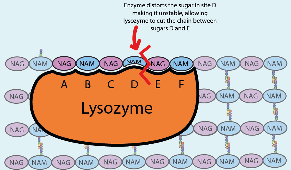 Lysozyme is structured in such a way that its active site is able to wrap around and bind with six of the NAM and NAG sugar units of the cell wall, the peptidoglycan. Upon binding the fit is perfect but the NAM sugar site D in the bacterial cell wall (see Figure 2) is now strained, making it unstable and more reactive. This allows lysozyme to cut the bond between the sugar units in the D and E sites, breaking the peptidoglycan into fragments. Lysozyme then detaches from the site and finds another site to bind with and cut. In this way the bacterial cell wall is increasingly weakened as lysozyme makes more and more cuts in the cell wall.