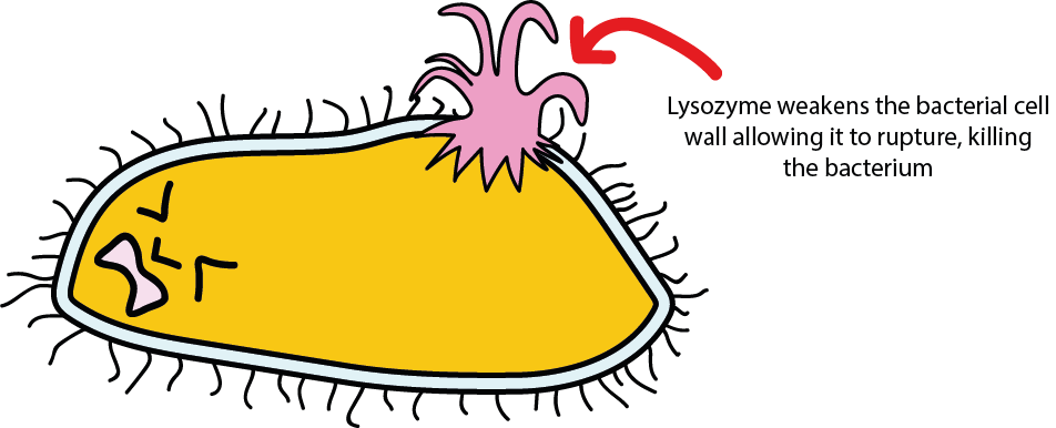 The cell wall protects bacteria from taking up too much water and exploding. Lysozyme kills bacteria by attacking the cell wall, causing it to rupture and the bacterium to die. The mechanism of the attack is shown in Figure 2.