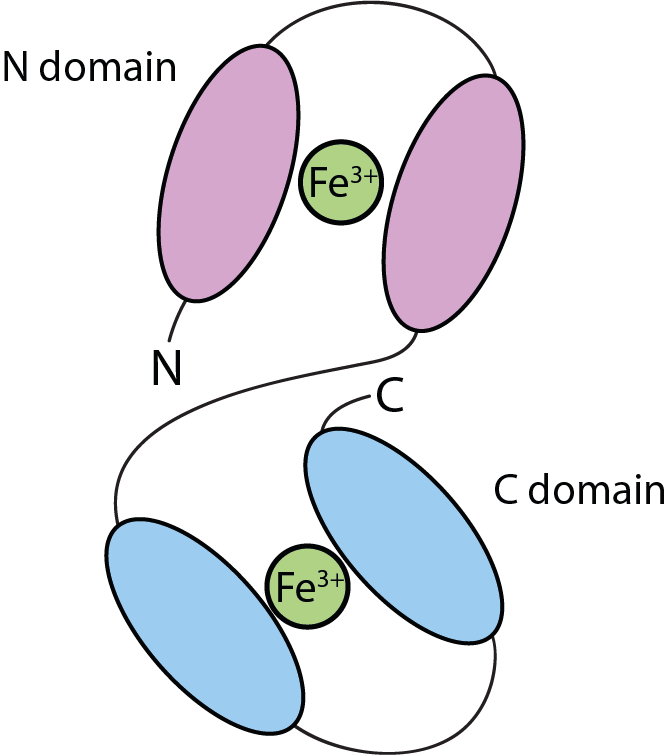 The two main domains in the lactoferrin molecular structure are ideally set up to accommodate Fe3+ ions, thus lactoferrin binding Fe3+ ions from the surroundings makes these ions unavailable to bacteria, and most bacteria need these ions to promote their growth.