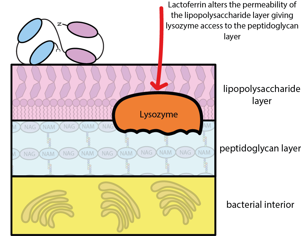 The cell wall of bacteria is protected by a layer of, essentially, fat and sugar molecules (a so-called lipopolysaccharide layer), a little bit in the spirit of impregnating a rain coat. By binding to this protective layer, lactoferrin alters the layer’s permeability and eases the access to the structural part of the cell wall (the peptidoglycan layer) for the lysozyme molecules. Lactoferrin in this way enhances the antibacterial action of lysozyme.
