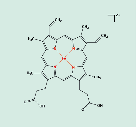 Figure 1: The core unit of the haemoglobin protein complex, showing the central Fe2+ moiety (the haem group) that allows reversible binding of O2 molecules.