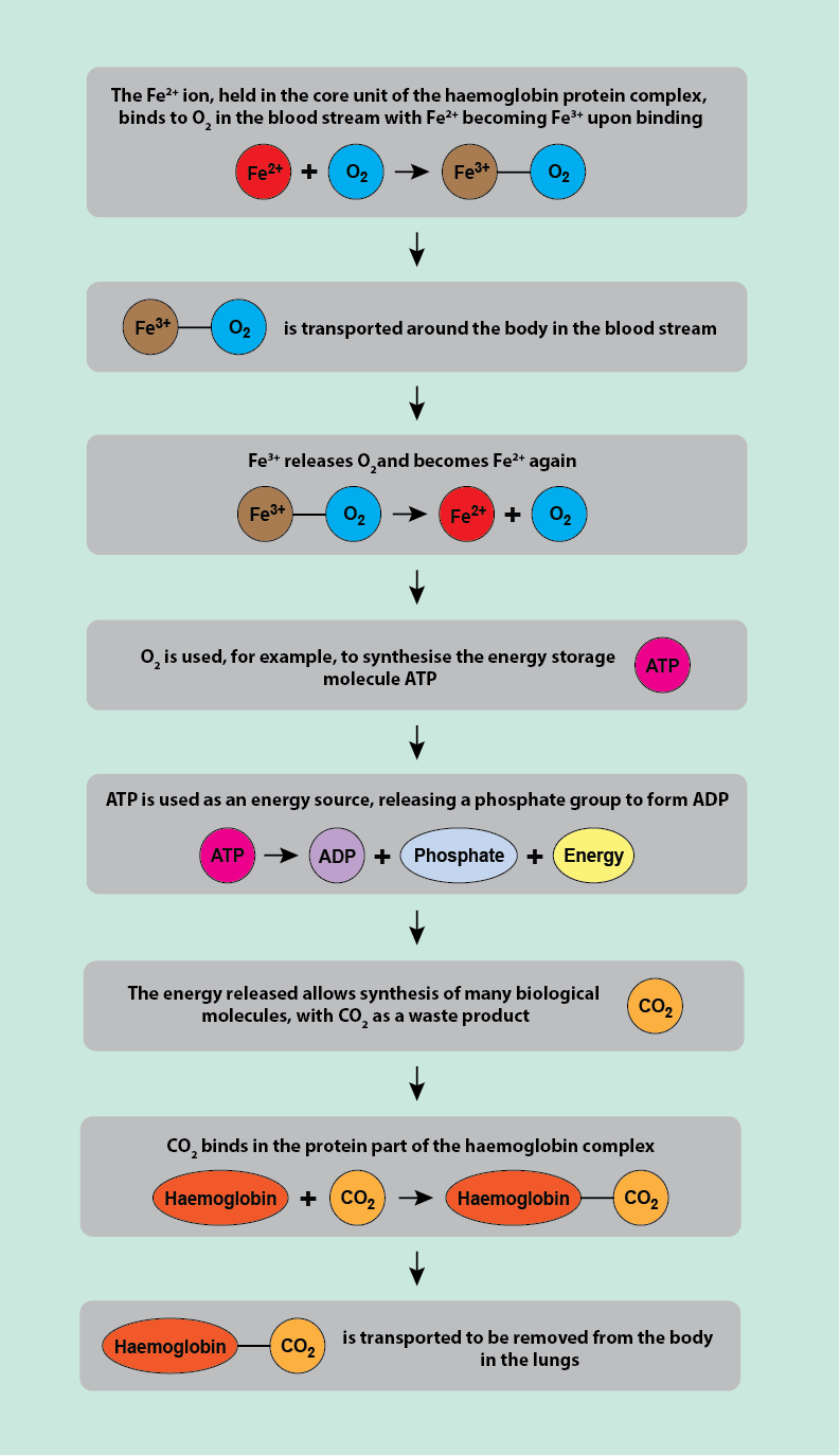 The erythrocytes (red blood cells) are responsible for the oxygen (O2) transport by blood from the lungs to all body tissues, in the process known as aerobic respiration. The erythrocytes carry out this task by making use of a large (typically a tetrameric complex in adults) protein, haemoglobin (Figure 1 shows the crucial centre part, the ‘working unit’ haem of the molecular haemoglobin arrangement). Haemoglobin makes up the majority of the mass of the red blood cells and increases the blood’s ability to transport oxygen by nearly two orders of magnitude, compared with the amount that could be circulated by simply dissolving O2 in the plasma alone.