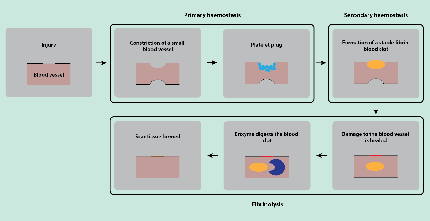 Haemostasis, stopping bleeding after injury by sealing of the injured wall of a blood vessel may be seen as a three-step process. The first step (primary haemostasis) is a rapid emergency response to stop or reduce further blood loss. This is followed by secondary haemostasis, the stage of formation of a blood clot that is stable enough to permit healing of the wound and the injured blood vessel. The final stage of the process, after healing, is called fibrinolysis and is the process that removes the then no longer necessary blood clot from the healed site of injury. This chronology of events is illustrated in the sketch in Figure 3.