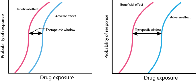 Figure 2 shows that both the probability of the desired response (red trace) and the adverse response (blue trace) will increase with increasing drug concentrations. For each drug a decision will have been made as to what extent the beneficial effects of the drug outweigh the adverse ones. The answer will be very dependent on both the drug and the condition being treated. Obviously, drugs which are characterised by a wide therapeutic window are safer to use than those with a narrow therapeutic window (a well-known drug with a narrow therapeutic window is paracetamol).