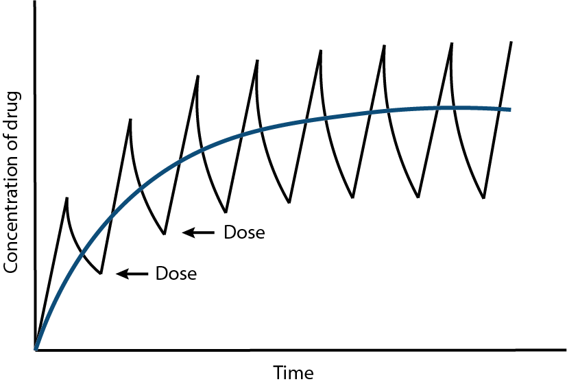 Drugs will be prescribed to be taken as a fixed dose with a fixed time interval between doses. This means that the concentration of the drug in the body will be constantly changing, but will eventually rise towards a fixed value - known as a plateau. This is because each time a new dose is taken, only some of the drug from the previous dose will have left the body. This is illustrated in Figure 3.