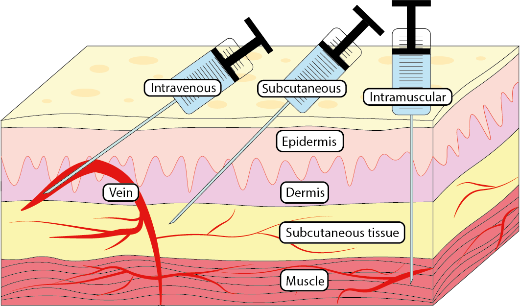 When drugs are injected they can be injected in one of three main ways (see Figure 4): intravenously (into a vein), intramuscularly (into a muscle) or subcutaneously (into a layer of fat and connective tissue under the skin). Intravenous delivery is the fastest method with drugs reaching their target in seconds, whereas intramuscular and subcutaneous injections provide a slower continuous release of a drug (with intramuscular delivery being faster than subcutaneous).