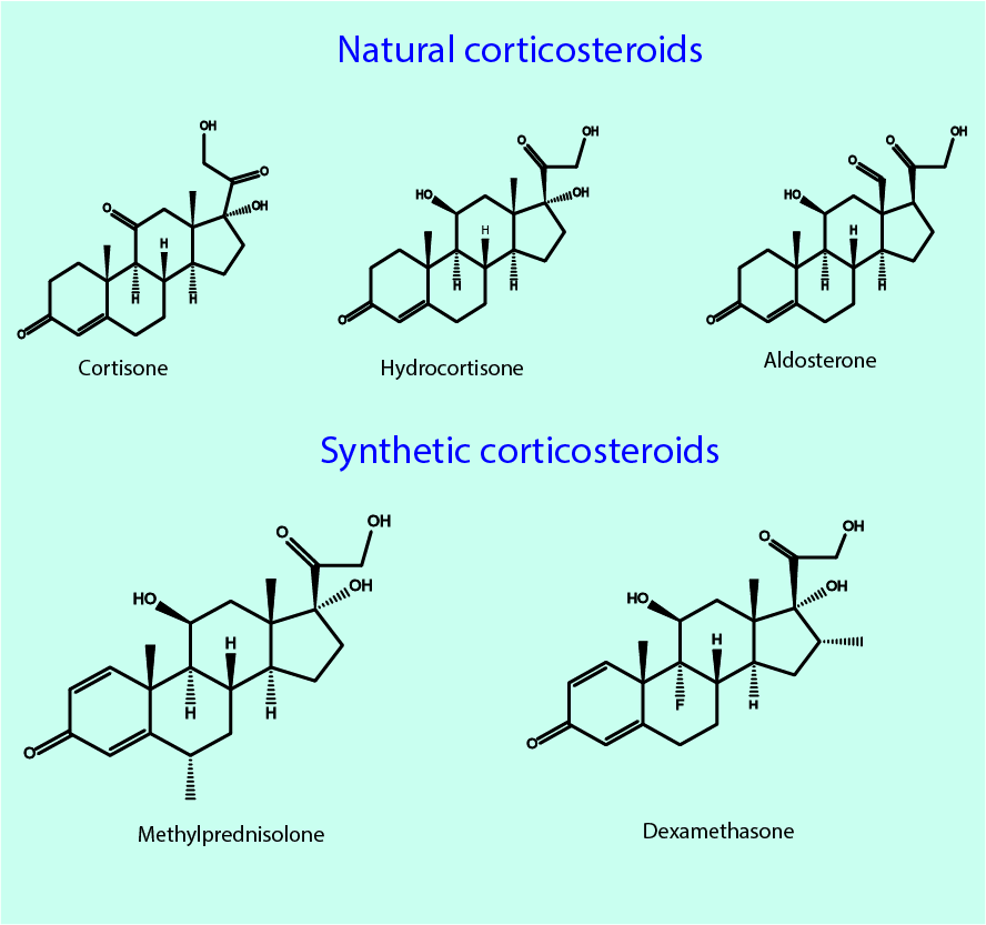 Cortisone, hydrocortisone and aldosterone are produced in the adrenal glands in very small quantities. Aldosterone mainly regulates electrolytes and water metabolism. Cortisone and hydrocortisone are glucocorticoids. The bottom part of Figure 4 shows just two examples of very many synthetic corticosteroids, highlighting the close chemical similarity between natural and synthetic steroids.