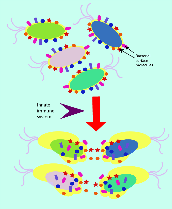 Invading pathogens (bacteria, fungi and viruses) typically carry some surface molecules (sugars and proteins) as part of the normal make-up of their surface structure. The precise nature of these surface molecules varies slightly between pathogens but there are common patterns and types of surface molecules (peptidoglycan is an example from the make-up of bacterial cell walls). The innate immune system is organised such that it can rapidly identify the presence of such typical surface molecules.