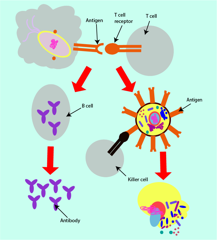 The second of the two strands of adaptive immune system response is mediated by T cells (subtype of white blood cells, also active in the innate immune system). It is a cellular response in which the binding of the antigen with the T cell receptor results in the production of specialised killer cells. These specialised cells are capable of destroying the invading pathogen. They do so by causing holes in the cell membranes of the microorganisms, leading to leakage from the pathogen cells and eventual cell death.