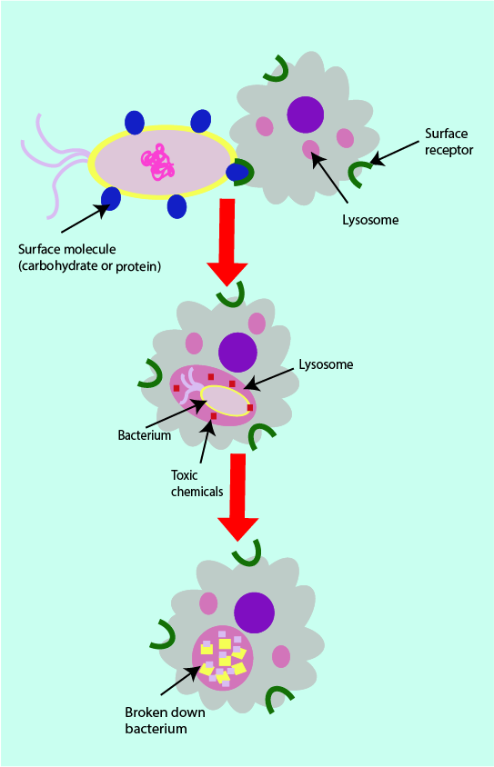 When a phagocyte surface receptor binds to a surface molecule of an invading microorganism, the phagocyte engulfs the pathogen completely by surrounding it in what can be thought of as a bubble (a lysosome; see Figure 4). This process is called phagocytosis. Once the pathogen is encapsulated by the lysosome, the phagocyte produces toxic chemicals inside the lysosome (hydrogen peroxide, superoxide and nitric oxide) in order to destroy the pathogen trapped inside. The chemically decomposed pathogen debris becomes the major component of pus in infected wounds or in an abscess.