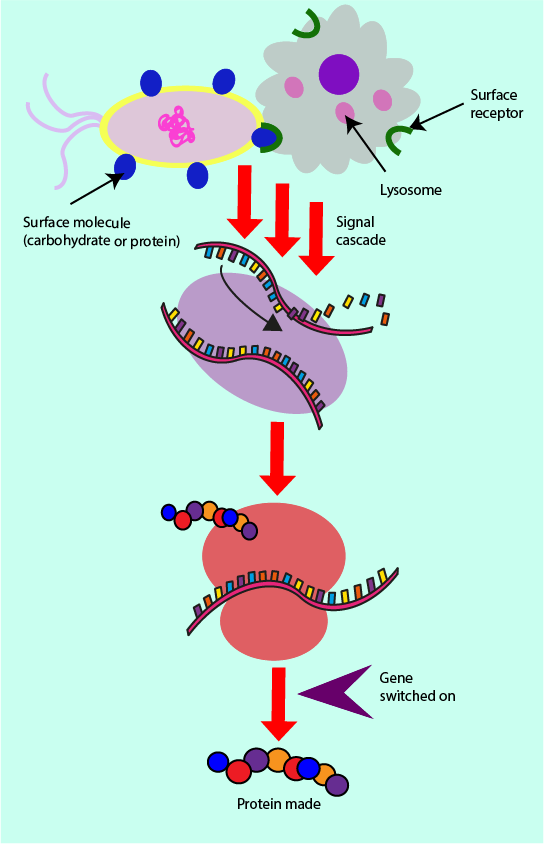 Other receptors on the surface of phagocytes can bind to a range of further molecules on the surface of pathogens and generate what is known as a signal cascade. A set of biochemical signals and reactions, one after another, is triggered which eventually leads to the synthesis of particular proteins in the cell. Such a cascade is schematically illustrated in Figure 5. It is a series of events which involve the DNA contained within the nucleus of a cell (shown in purple). These processes allow for certain genes to be switched on or off, by the means of a protein molecule switch known as a transcription factor. If a gene is switched on, the ‘recipe’ for making the corresponding protein is made available and so the protein can be produced by the cell. A wide range of proteins produced by such signal cascades are involved in the immune response.