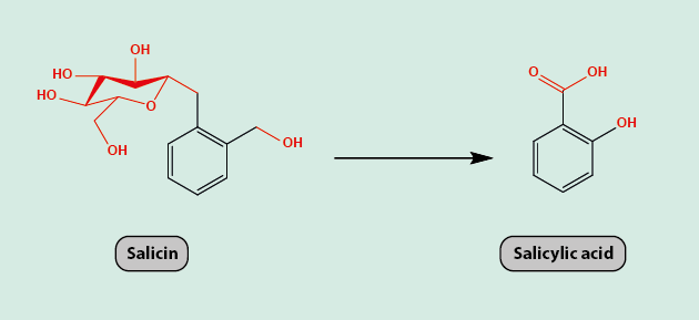 For 3500 years, willow bark was used as an analgesic with the active agent in it being salicin. The metabolism/oxidation of salicin leads to salicylic acid (Figure 2), the precursor of aspirin. Salicylic acid has the same analgesic properties as salicin but causes gastric irritation and so is not tolerated well as a drug.