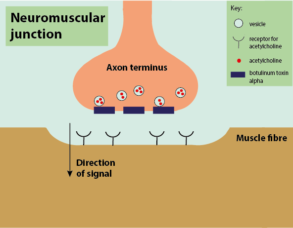 All botulinum toxins work by inhibiting the release of the ubiquitous neurotransmitter acetylcholine. Acetylcholine is an excitatory neurotransmitter that works at the neuromuscular junction. When acetylcholine is released by motor neurons, it activates the muscle. When acetylcholine is blocked, the muscle cannot be activated, so the muscle is paralysed (Figure 1). The main mechanism by which botulinum toxins block acetylcholine is by preventing its release from the vesicles at the neuronal endings.