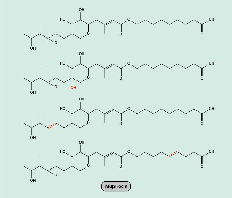 Mupirocin has been known for approximately 50 years. It is isolated from some pseudomonas strains and, in common with other antibacterial agents isolated from bacteria, there are groups of bacteria that are naturally resistant to it. Mupirocin is a mixture of several derivatives of pseudomonic acid (Figure 1). The mechanism of antibacterial activity of mupirocin is based predominantly on its interference with the bacterial cell metabolism (RNA), hindering bacterial protein synthesis.