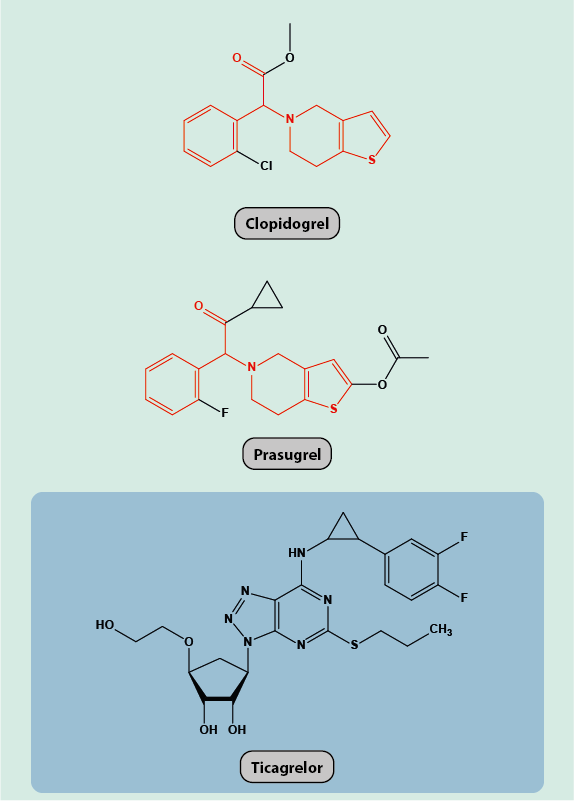 As depicted in Figure 1, ticagrelor belongs to a slightly different class of chemicals, compared with clopidogrel and prasugrel. Its effect is blockage of the receptor protein P2Y12 that is found on the surface of platelets, similarly to the P2Y12 protein blockage by clopidogrel and prasugrel. Blocking P2Y12 prevents the aggregation of platelets and thus the formation of a blood clot. The resulting, most prominent adverse effect of ticagrelor (and other antiplatelet medications) is a tendency for excessive bleeding.