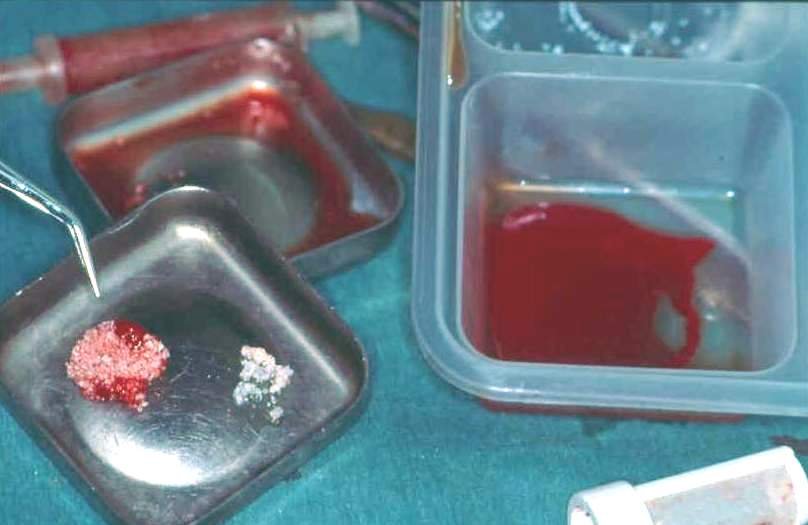The term platelet-rich plasma (sometimes called platelet concentrate) refers to a process where somebody donates a small amount of their own blood, approximately 10 to 20 ml. The plasma is separated from the other, solid blood components in a small centrifuge and thus is enriched in platelets relative to the full blood. The platelet-rich plasma is then applied to a surgical site, for example a bone graft from the pelvis to cover a defect in the mandible. It is thought that the unique properties and various roles of platelets in wound healing may lead to earlier vascularisation and integration of the bone graft at the recipient site, if platelets are present at an enhanced concentration (Figure 1).