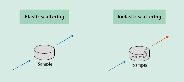 The monochromatic light is typically provided by a laser, the wavelength of the light / the photons (particles of light) is usually in the infrared to ultraviolet range of electromagnetic radiation. When the incoming light hits the sample, most of the light is scattered without any further interaction with the sample. This bouncing of the incoming light off the sample is known as elastic scattering, it preserves the wavelength of the incoming light. The outgoing light after elastic scattering has the same wavelength as the incoming light as no energy is exchanged between the sample and the light.