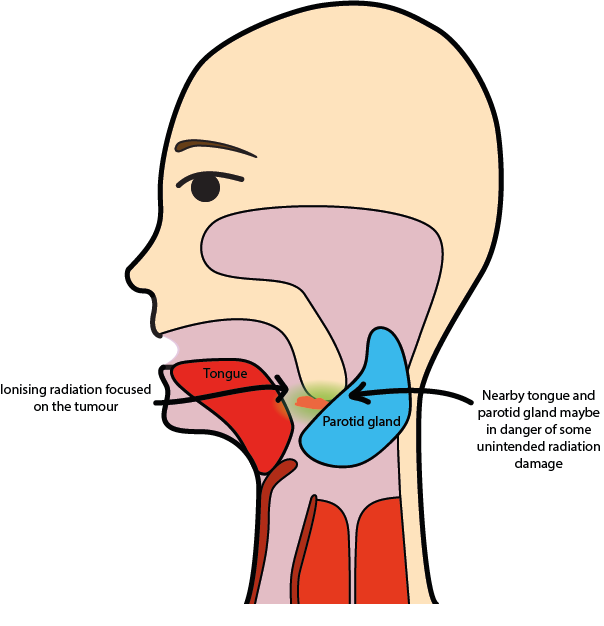 Multiple beams are used to maximize delivery to the tumour target volume yet minimizing the effect on adjacent healthy tissue such as salivary glands, spinal cord and lens of the eye. The accuracy of this process is improved by CT planning and sophisticated irradiation schemes such as intensity modulation (IMRT, see below).