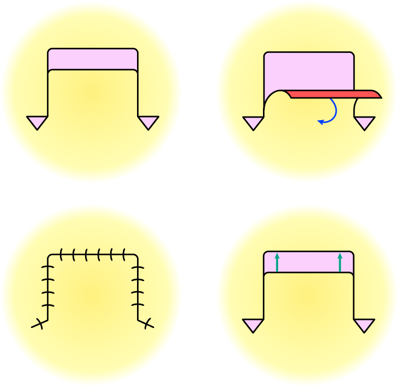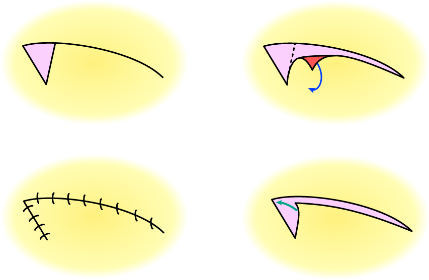 Figure 4 illustrates the principle of a simple rotation flap, suitable to cover a wedge-shape defect. The length of the incision line needs to considerably exceed the length of the short side of the defect (by about three to four times), the flap is rotated toward the far long side of the defect.