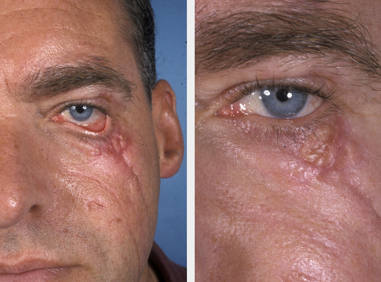 It has been shown that secondary intention healing can give excellent functional and cosmetic results, particularly if used for small defects in concave regions. This technique may also be useful in larger areas where contraction of the wound during healing is not cosmetically or functionally important. The longer healing time, increased wound care and poorer cosmesis must be taken into account when judging the appropriateness of this technique (see Figure 1 for an example).