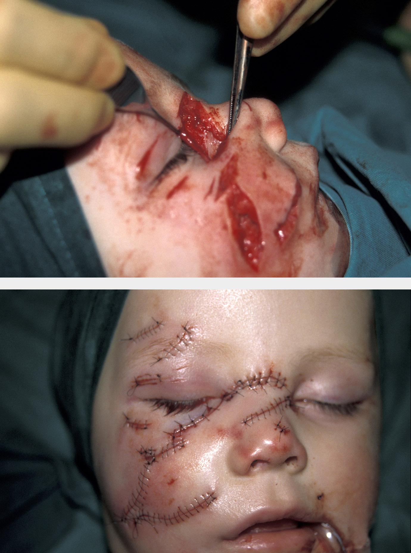 Almost every injury involving a breach of the skin will result in a degree of scarring. In many circumstances, scars are in areas where they will not readily be noticed by other people and therefore they are of little or no consequence. Indeed, even in clearly visible areas, scars are often so fine as to be barely noticeable, or may be disguised within the natural skin creases or relaxed skin tension lines. Elective incisions for surgery are designed such that they respect the relaxed skin tension lines and so produce as minimal scarring as possible. However, trauma has no respect of aesthetics and therefore the scar produced by a trauma wound may prove to be particularly unsightly. Linear wounds tend to develop more obvious scarring than do irregular wounds unless a linear repair eyebrow has been mismatched (see Figure 12. Good wound care, early suture removal, moisturisation and massage all help to reduce scarring.