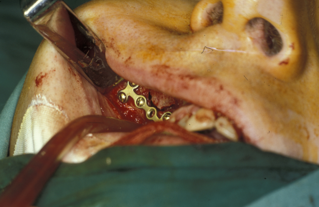 The first manoeuvres during fracture repair are disimpaction and restoration of the fracture fragments to their premorbid position. Le Fort I fractures are treated by simply disimpacting the fracture and then closing the patient into their normal occlusion. Once the occlusion has been restored, temporary IMF (fixation) is applied. An incision in the maxillary buccal mucosa allows access to the buttresses and pyriform aperture (pear-shaped opening in the skull). The fracture is then exposed and mini plates placed. Two plates are normally placed on each side to stabilise the fracture; an example is shown in Figure 19.