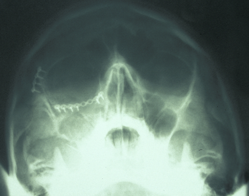 Access is via a coronal flap, which exposes the frontal bone, orbital roof, medial orbital wall, and nasal bones. If the frontal bone is minimally displaced it is reasonable to reposition the fragments and fixate by microplating. In the case of missing frontal bone the sinus can be directly examined for posterior wall fractures, CSF leak and mucosal damage. If the frontal bone fragments are displaced but not missing, it may be necessary to carry out a mini-craniotomy (removal of some bone from the skull) of the frontal bone overlying the frontal sinus in order to adequately examine the frontal sinus. If the mucosa is significantly damaged, one school of thought is that it should be completely excised, the frontonasal duct obliterated and the sinus obliterated by bone graft. If the posterior sinus wall is involved a popular neurosurgical technique is to remove the posterior wall, carry out dural repair and allow the brain to expand into the defect ‘cranialization’. The most important issue is whether the sinus is maintained, in which case it must have adequate ventilation via the frontonasal duct as described above.