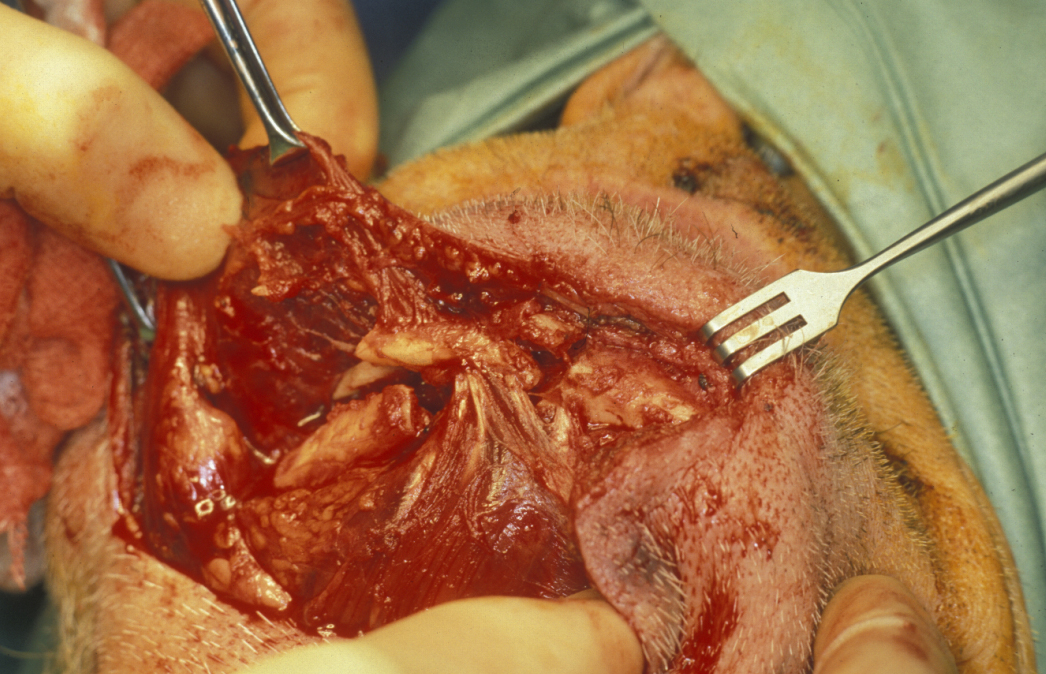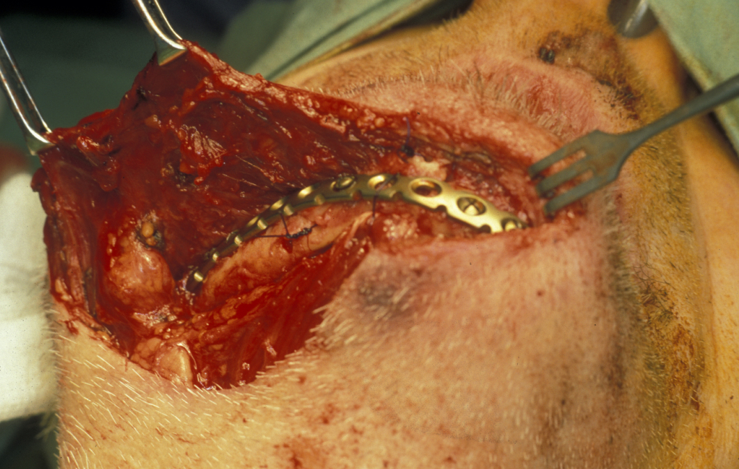 Malunion and even non-union are common and eating and nutrition deteriorate rapidly. Fracture repair is best done by keeping the maximum possible amount of periosteum intact and plating via an extraoral approach using a more rigid plate with bicortical screws that confer far greater rigidity and stability to the fracture site (see Figure 7 and Figure 8). This approach carries a greater risk of damage to the inferior alveolar neurovascular bundle but is balanced by the far higher success rate compared with conservative or monocortical plating techniques.