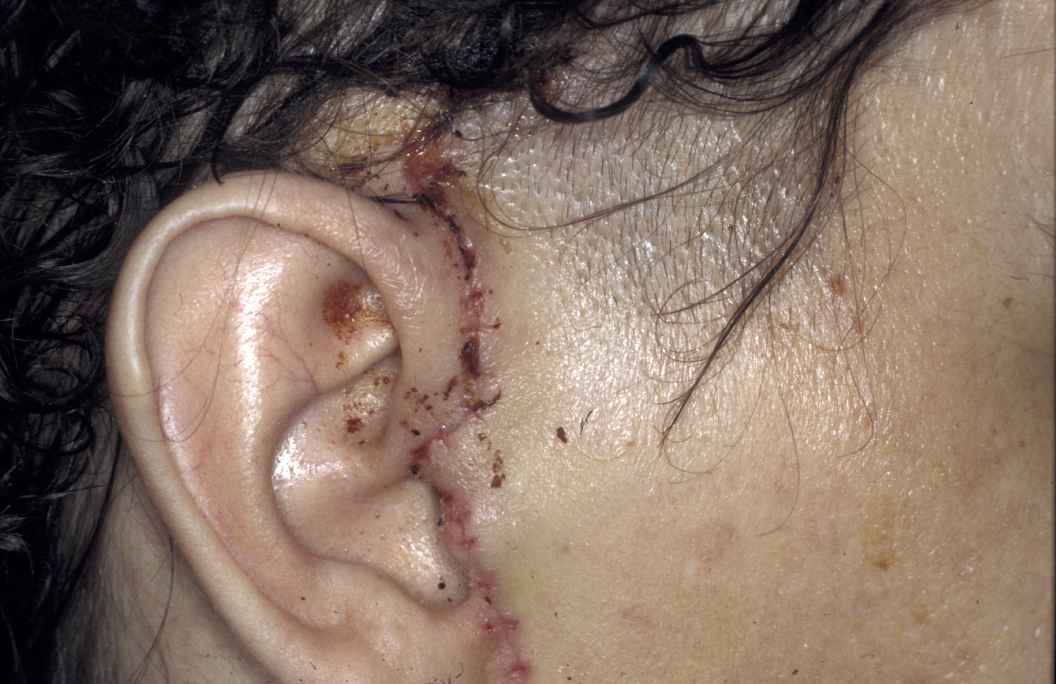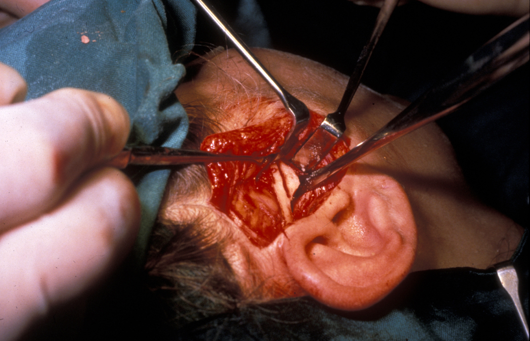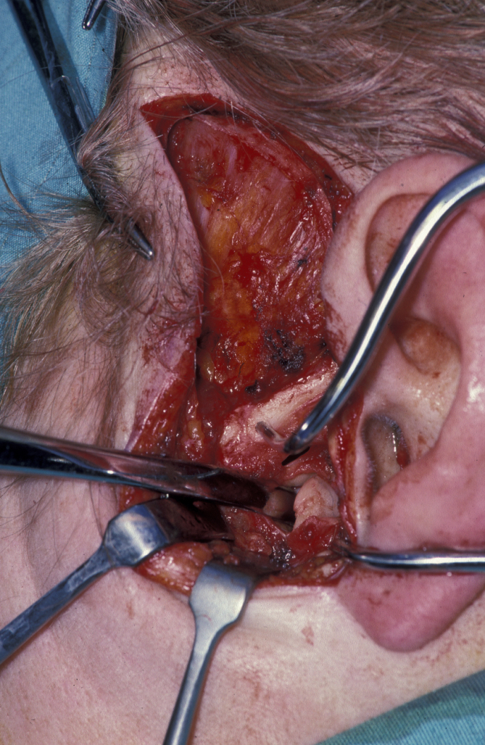 Treatment in the first instance is essentially along the lines of treatment for TMJDS (see above). Steroid (anti-inflammatory) injections into the joint are useful for pain relief, but can damage the articulating surfaces in the joint further and may result in accelerated joint destruction. Excision of pannus (inflammatory synovial (viscous fluid) tissue in rheumatoid joints that covers the articular cartilage and progressively destroys the articular cartilage) via a standard preauricular (in front of the ear) approach can relieve symptoms (see Figure 3). Total condylar destruction may necessitate prosthetic joint replacement.