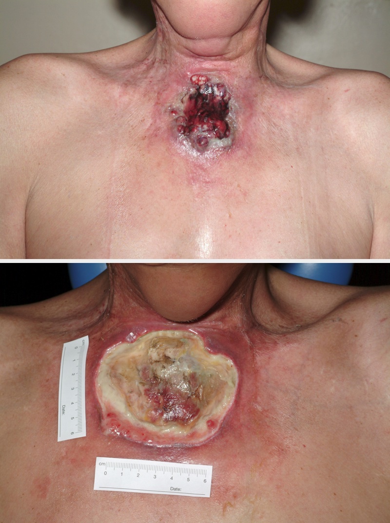 Necrosis affecting deeper tissue layers, including muscle and fascia, is most likely to be part of a serious infection or may result as a long-term effect from radiotherapy. As such, the most likely treatment options will be (emergency) radical surgical intervention and systemic antibacterial medication when infection is involved (similar in spirits to the surgical management of severe abscesses). These conditions are likely to require radical resection of necrotic tissues, with reconstruction to follow (either immediately following resection (see Figure 2 for an example), or after a delay until eradication of infection has been achieved). Necrosis of deeper tissue layers, such as necrotising fasciitis, may invade bigger vessels and thus carries a risk of serious haemorrhage that may require emergency surgical intervention.