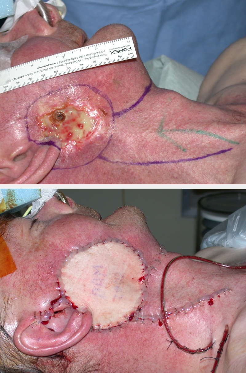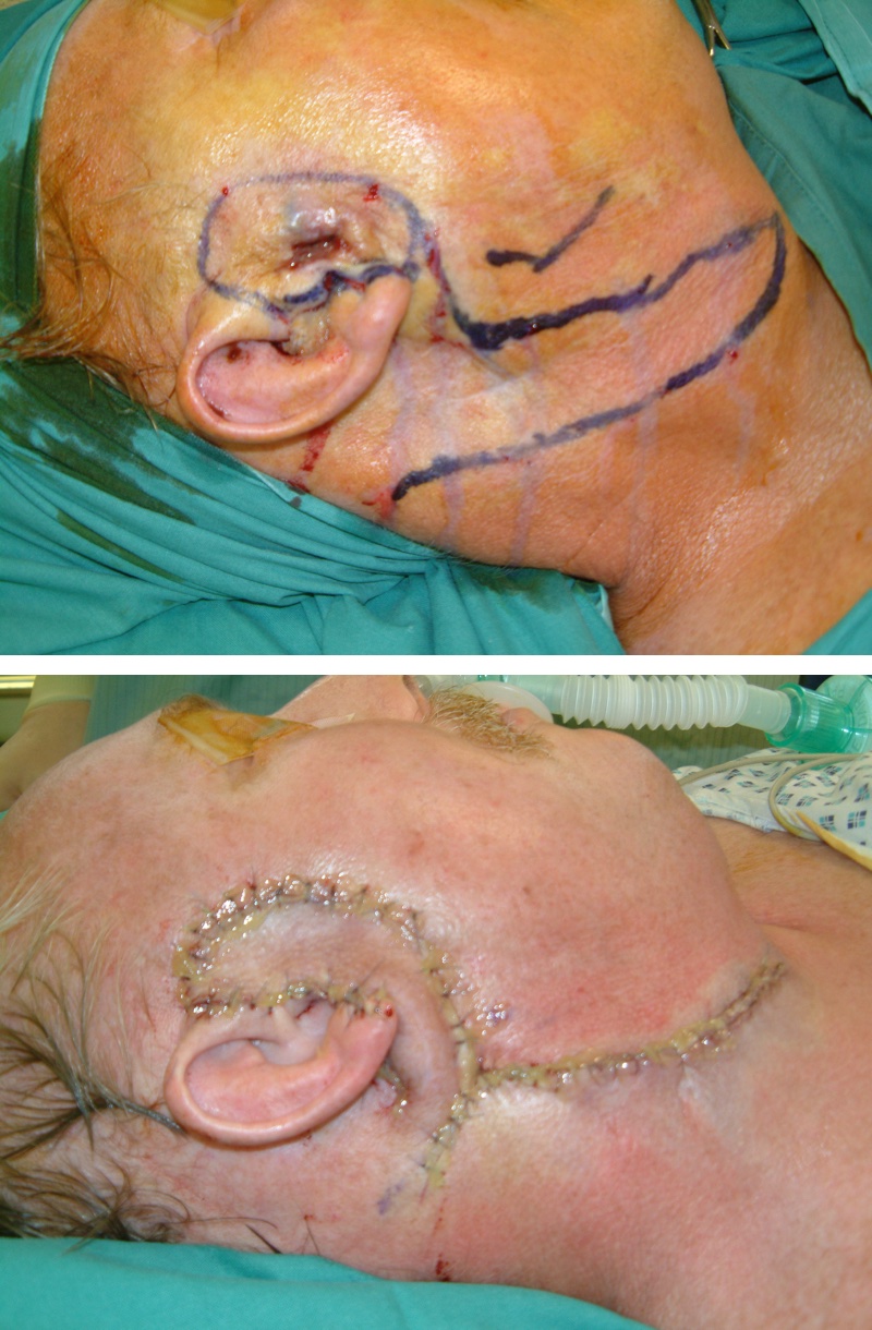 When surgical débridement or more radical resection is the method of choice, resulting relatively minor skin defects in need of reconstruction can be repaired with a skin graft as long as any infection has been cleared. For larger skin defects, like for oral mucosa, reconstruction by a flap is the preferred method. This is especially the case for extended skin necrosis following radiotherapy (Figure 4).