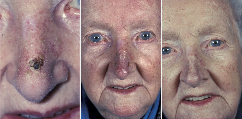 Skin grafts may be the treatment of choice in certain defects, but equally they may be the only option because of a lack of adjacent tissue or the size of the defect. Three types of skin grafts are commonly used: full-thickness, split-thickness and composite grafts. The full-thickness skin graft is the most useful for facial reconstruction. Commonly used as the treatment of choice for the nasal tip and the lower eyelid, it is also useful for defects of the nasal alae (see Figure 1) and the ear, as well as for larger defects of the temple and forehead. Suitable donor sites are the postauricular (behind the ear) region and the supraclavicular (above the collarbone) area of the neck.