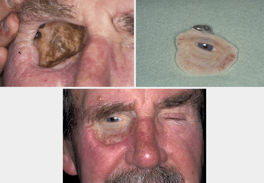 Solitary ear prosthesis was traditionally retained with glue (unsatisfactorily!). The advent of osseointegrated implants heralded a major improvement in this area. Larger complex defects involving the skin can be ‘reconstructed’ using multi-pieced obturators retained with implants, interconnecting joints or spectacles. However, the skin component coloration tends to fade with time and sun exposure. Facial components look good when they are still, but facial movements display gaps. However, they are better than patches.