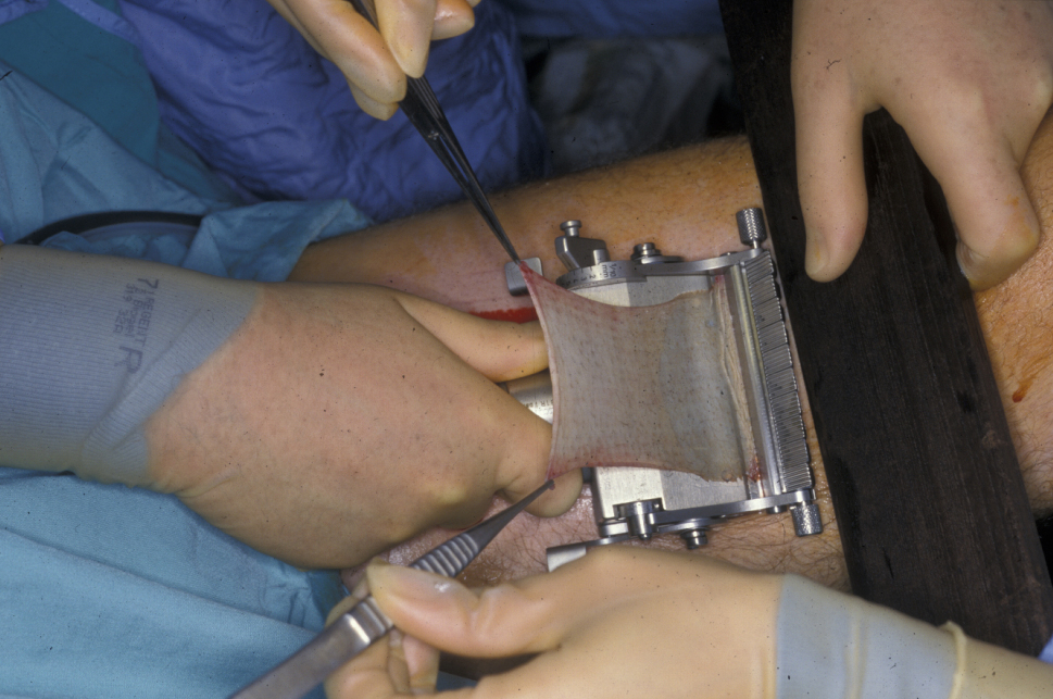 Split-thickness grafts are harvested from the inner thigh (see Figure 2) or arm either manually or with an electric dermatome.