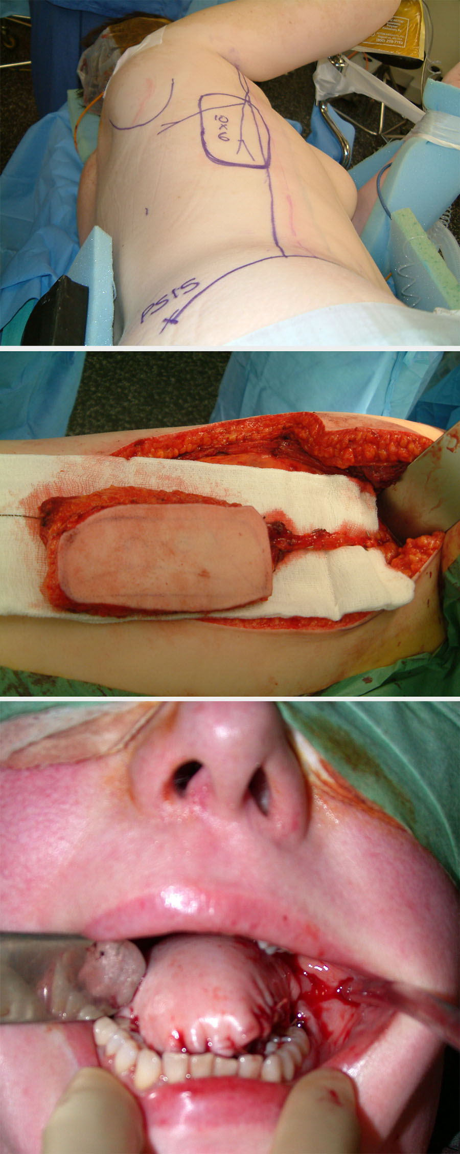 Where the majority of the tongue has been removed, there will be little or no residual function. This defect is best reconstructed with bulk (for example, a pedicled pectoralis major flap) or large free flaps such as a latissimus dorsi flap (see Figure 5), or a rectus abdominis flap.