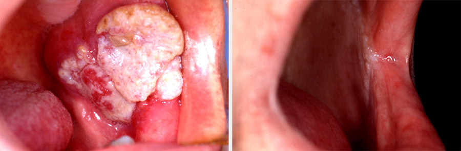 The main requirement for this defect is to obtain closure by covering the area with a pliable lining while allowing for normal mouth opening. Superficial lesions can be excised with a laser and left to heal or repaired with a skin graft. Small deeper defects can be closed with a local flap. A large and deep defect is better repaired with a radial forearm free flap (see Figure 6). Through-and-through defects require bipaddled repair.
